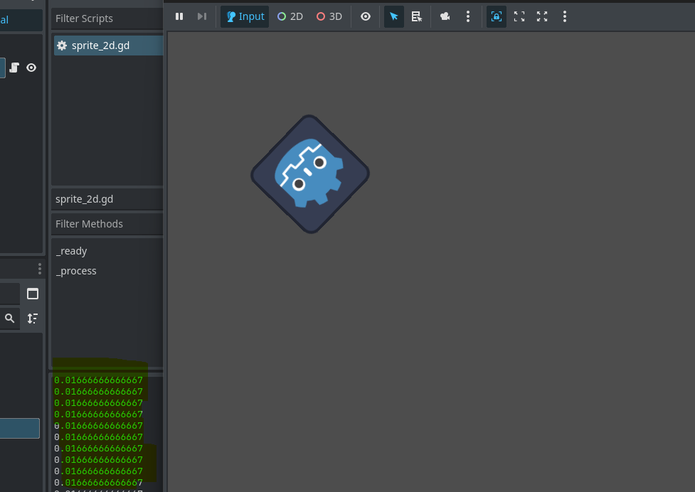 Zwróć uwagę na zaznaczone na zielono liczby w konsoli – 0.0166666s – tyle czasu mija u mnie między klatkami. Żeby policzyć ile to jest klatek na sekundę wystarczy podzielić 1/tę liczbę – czyli 1/0.01666 w zaokrągleniu da 60. 60 klatek na sekundę – i to się zgadza, bo mam na tyle zablokowane wyświetlanie obrazu (tzw. VSync – odświeżanie pionowe, Godot domyślnie trzyma się wyświetlania ustawionego w systemie – można wyłączyć w Project Settings).