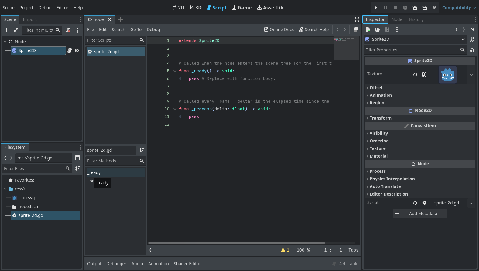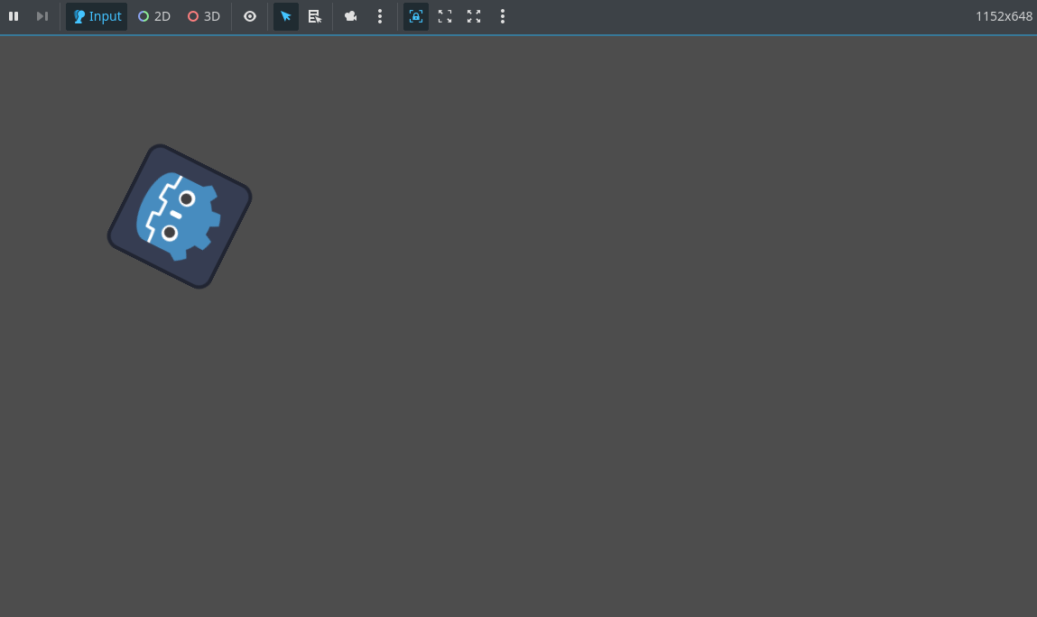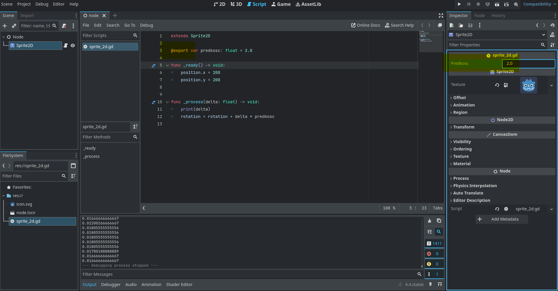 Klikamy w oknie Scene prawym przyciskiem myszy na Sprite2D i dodajemy skrypt (Attach script). Tworzymy skrypt na domyślnych ustawieniach. Obrazek możemy dodać własny w inspektorze w polu Texture lub po prostu przeciągnąć tam plik icon.svg z okna Resources (domyślna ikonka projektu). Powinniśmy mieć mniej więcej taki projekt: