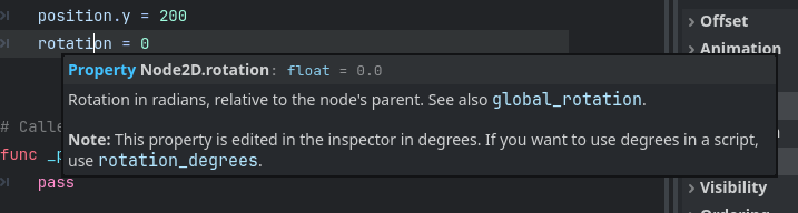 Rotation in radians – obrót jest zapisany w tej zmiennej w radianach. Dla wnikliwych polecam na Wikipedii. Nam wystarczy, żeby pamiętać, że jest różnica. W tym samym okienku mamy tez podpowiedź, że możemy używać właściwości rotation_degrees. Sprawdźmy – zamień rotation na rotation_degrees, 90 zamiast 0 i uruchom ponownie: