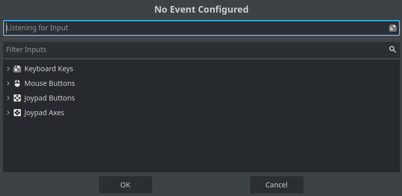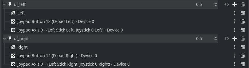 Widać tutaj, że pod każdą akcję są po 3 opcje podpięte – klawisz strzałki, przycisk D-pada oraz gałka pada. Liczba na prawo od nazwy akcji to tak zwany deadzone – można to nazwać progiem czułości w przypadku analogowych kontrolerów. Gdyby było 0, to przy najmniejszym drgnięciu gałki pada (albo dryfujący analog) byłaby rejestrowana akcja, co nie jest pożądane. Domyślnie zakres jest ustawiony tak, żeby reakcja była od połowy możliwego ruchu (0.5 przy zakresie 0.0-1.0).