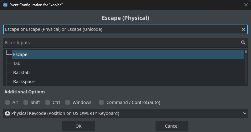 Na górze okna z Input Map kliknij w pole Add New Action i wpisz w nim koniec. Zostanie utworzona nowa akcja – znajdź ją na liście i kliknij + obok niej. Wyskoczy okienko w którym wciśniesz Escape: