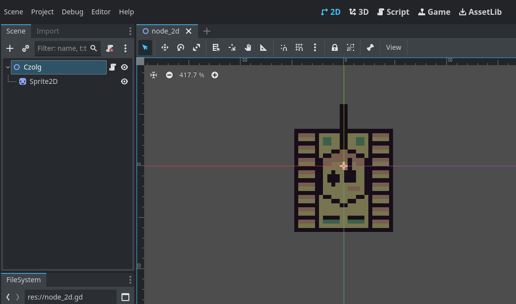 Ale zanim przejdziemy do konkretów utworzymy nowy projekt – główny węzeł niech będzie typu Node2D i podrzędny Sprite2D. Do Node2D dodajemy nowy skrypt, a w tym skrypcie…