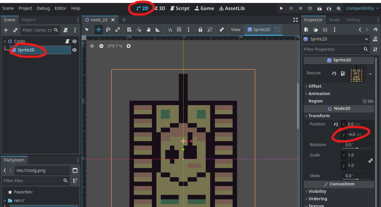 Przy okazji – czy widzisz, że czołg nie obraca się dokładnie wokół środka swojego korpusu? Dzieje się tak dlatego, że środek sprajta wypada trochę powyżej i tak domyślnie został ustawiony przy załadowaniu. Wygląda to tak dlatego, że na obrazku mamy jeszcze lufę, ale chcemy żeby obracał się wg środka samego pojazdu, a nie długości z lufą. Wejdź w widok 2D i powiększ, żeby zobaczyć o czym mówię: